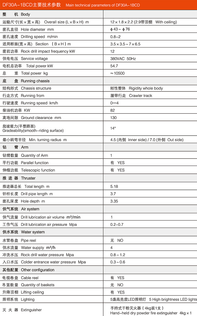 DF30A-1BCD主要適用于礦山、冶金、水電、鐵路、公路、采石場(chǎng)等領(lǐng)域的巷道、隧道、涵洞的開挖、掘進(jìn)工作。該機(jī)采用全液壓驅(qū)動(dòng)驅(qū),鑿巖速度可達(dá)0.8-2米/分。系統(tǒng)設(shè)有終點(diǎn)自動(dòng)停止沖擊、自動(dòng)防卡釬、感應(yīng)水排渣等功能,操作方便,安全可靠。該機(jī)車身小、結(jié)構(gòu)緊湊、重心低、機(jī)動(dòng)靈活、工作穩(wěn)定、爬坡能力強(qiáng)。該設(shè)備配備柴油機(jī)驅(qū)動(dòng)行走可實(shí)現(xiàn)多工作面作業(yè),轉(zhuǎn)場(chǎng)速度非常快;該設(shè)備具有平動(dòng)伸縮鉆臂使推進(jìn)梁全方位保持平行,可在14°斜坡道上鑿巖工作。鉆孔作業(yè)采用電動(dòng)工作大幅改善工作環(huán)境、降低噪音、降低粉塵、降低能耗。大幅提高施工效率和施工質(zhì)量。靈活的液壓鑿巖機(jī)構(gòu)對(duì)港道的工作面、頂板、側(cè)幫、底板均能鑿巖作業(yè)。該機(jī)不僅能鉆鑿掘進(jìn)炮孔,裝上本所專利推進(jìn)器后,根據(jù)斷面大小情況,還能很方便地鉆鑿錨桿孔。